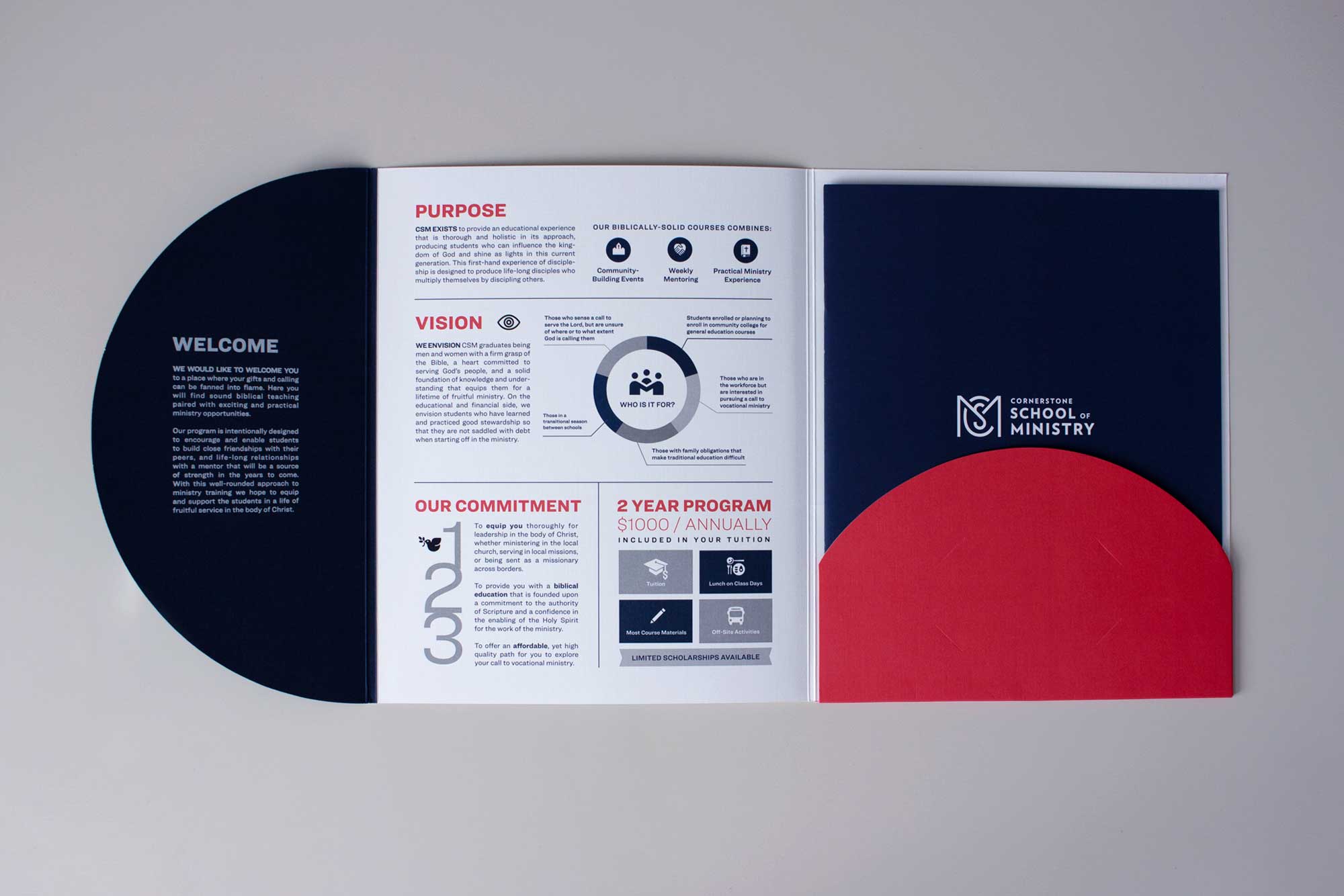 Situated in beautiful Long Beach, Cornerstone church offers a place for worship as well as a comprehensive biblical program. We created the visual branding for the launch of their new school program, including logos and an informational booklet to showcase the program’s offerings.